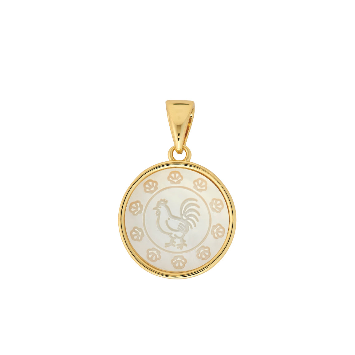 14k gold dipped mother of pearl charm delicately etched with the iconic Harbour Island rooster—a symbol of island life and spirited charm—surrounded by a delicate border of scalloped clam shells. Whether worn alone or layered, this charm captures the laid-back elegance and natural beauty of the island. Chain sold separately