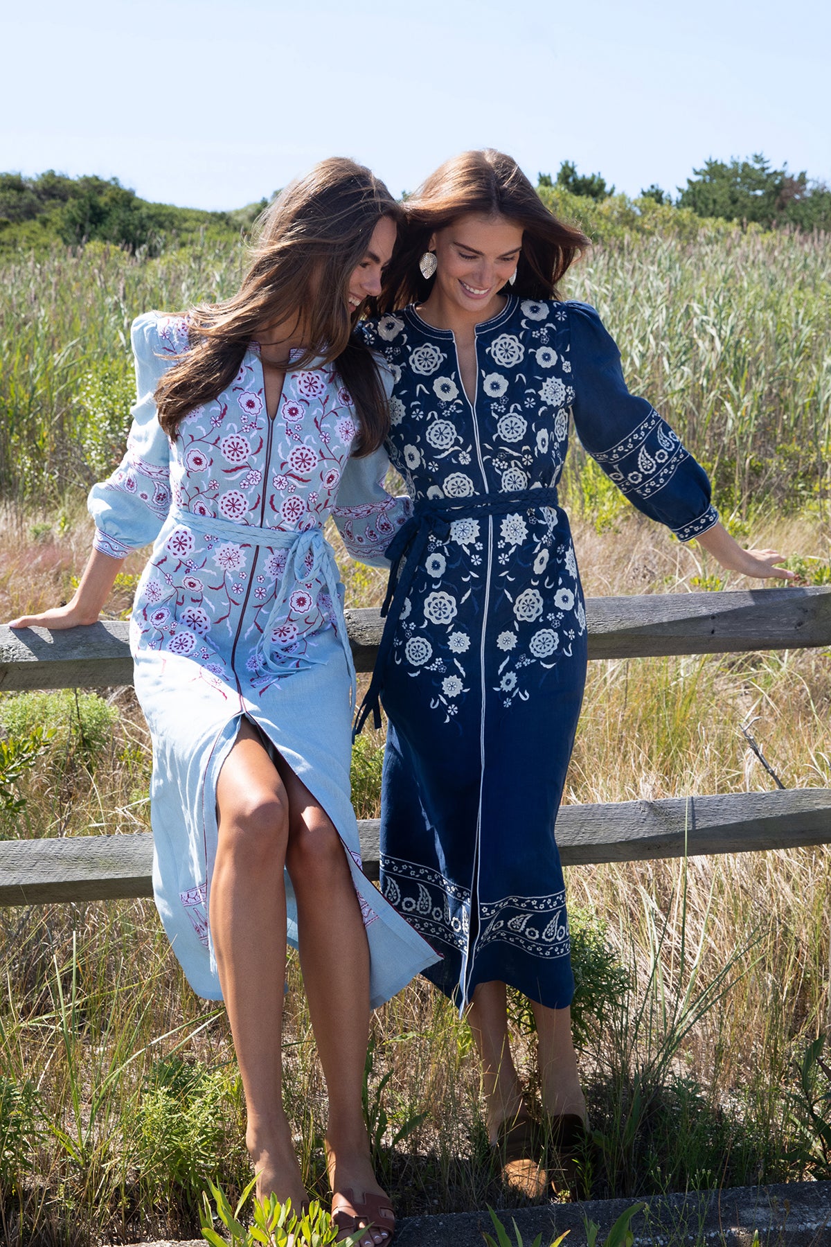 The Blythe is a study in bohemian elegance, cut from navy blue linen with a belted silhouette that flatters and moves with ease. Voluminous sleeves and a softly flared skirt are framed by intricate vine-like embroidery across the bodice, while swirling paisleys in cream trace the cuffs and hem.