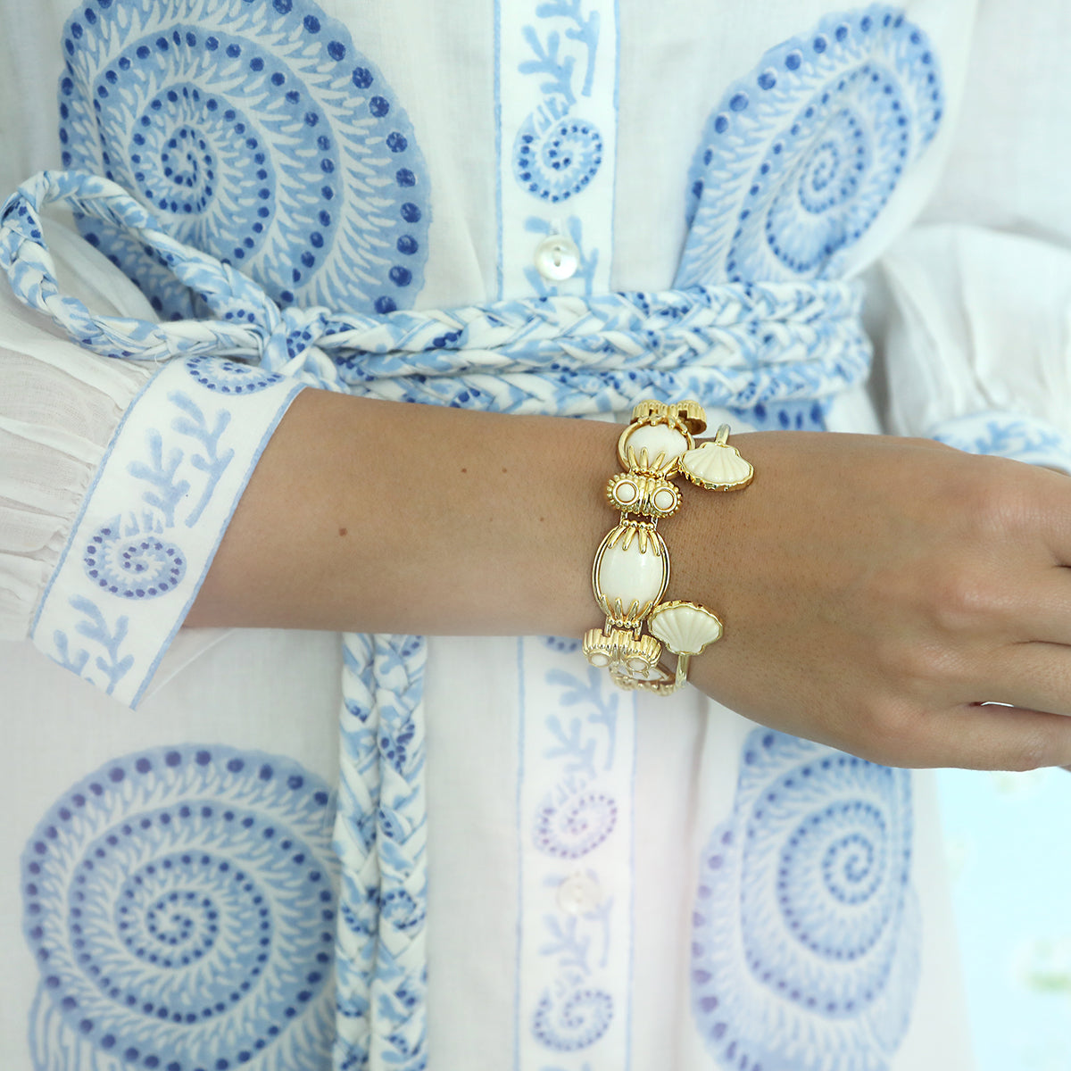 Wear our clam shell cuff on its own or pair with other bracelets for a lovely, layered look. 14k gold dipped cuff with faux ivory stone.