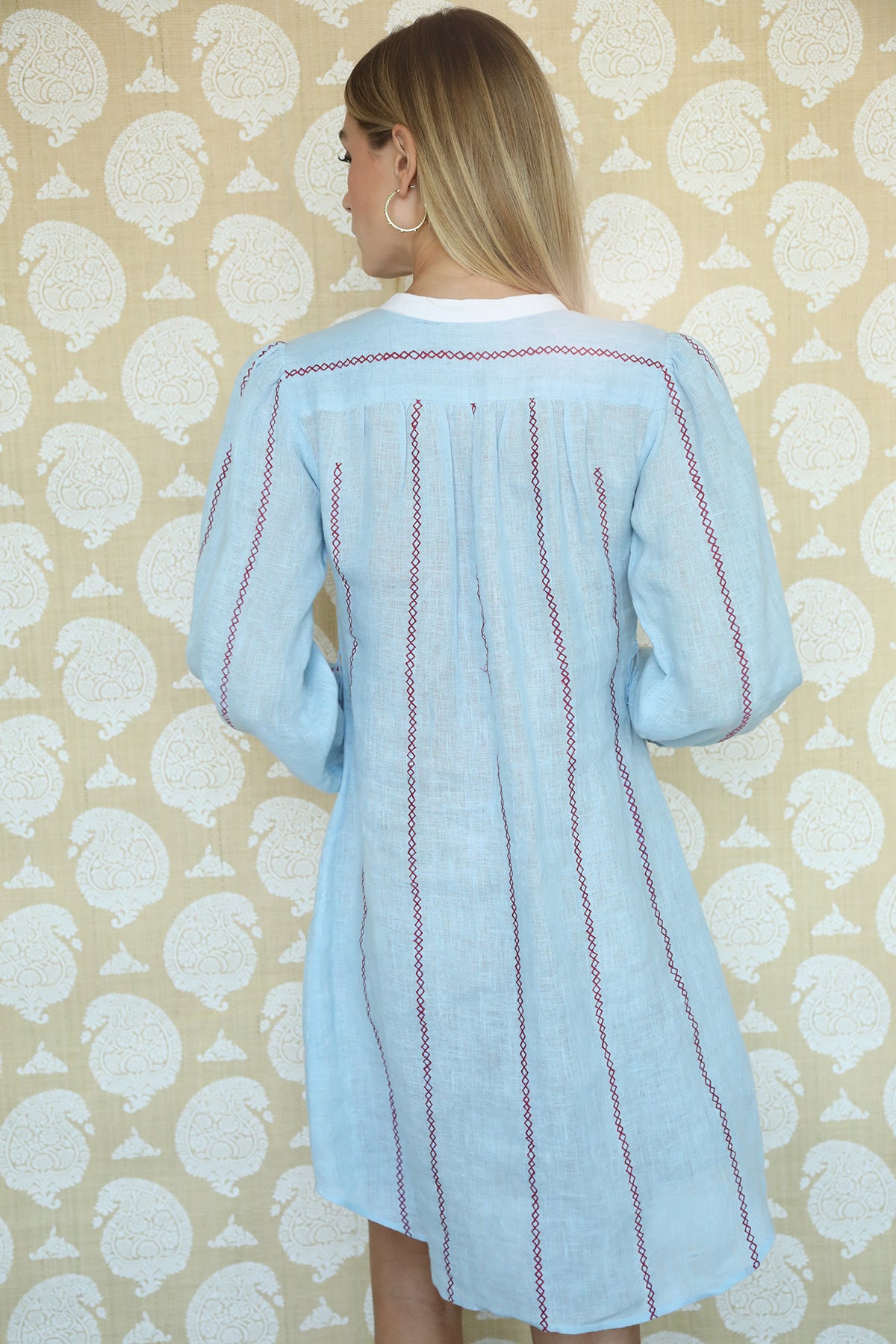 The Greer takes its cue from classic fall shirting, reimagined with a bohemian twist. Cut in sky blue linen, it’s striped with delicate burgundy embroidery and finished with a crisp bib front that nods to heritage tailoring. A self-tie belt cinches the waist, giving shape to the relaxed silhouette, while billowed sleeves add a touch of romance.