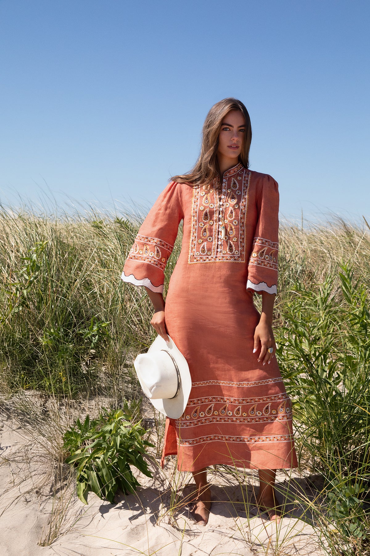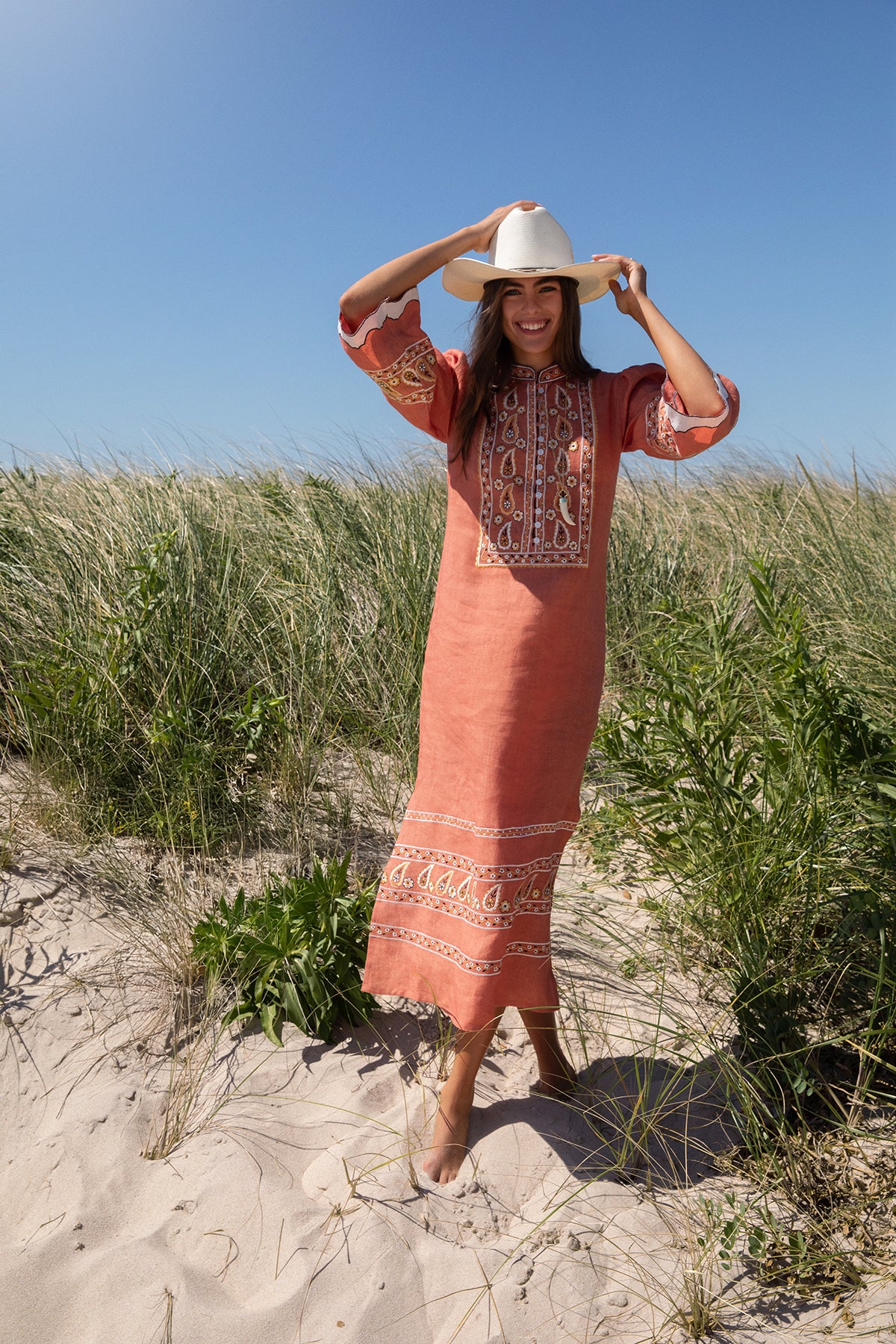 The Blythe captures the spirit of a bohemian fall. In warm terracotta linen, it’s detailed with swirling paisleys and delicate floral embroidery that feel timeless and hand-touched. Scalloped cuffs and embroidered bands add a note of artistry to the clean silhouette, making it as effortless as it is refined. From barefoot walks through dune grass to evenings layered with gold jewelry, Blythe is made for autumn’s shifting light and moments of ease.