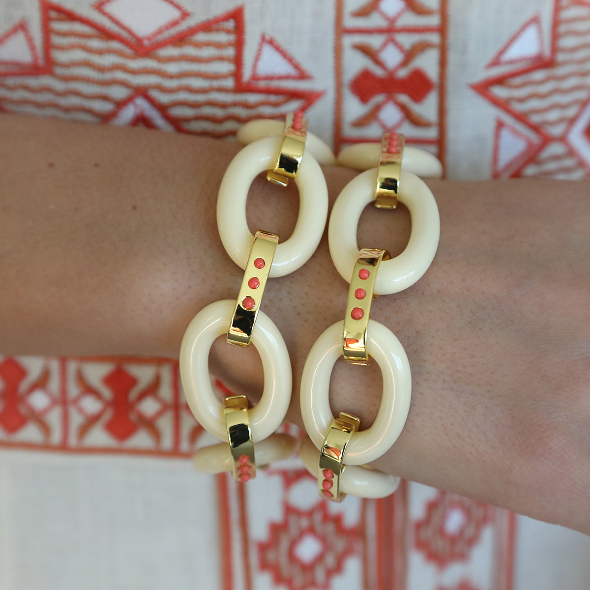 14k gold dipped with coral cabs and faux ivory chain link bracelet with spring ring clasp.