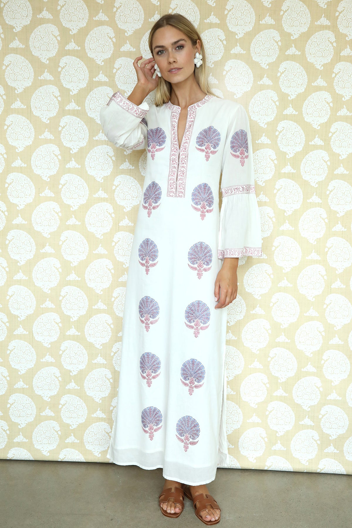 A celebration of artisanal heritage and effortless elegance, the Medallion Kaftan is adorned with hand block printed fan-shaped medallions inspired by traditional motifs. Rendered in a lavender and rose pink against soft ivory cotton, this s
