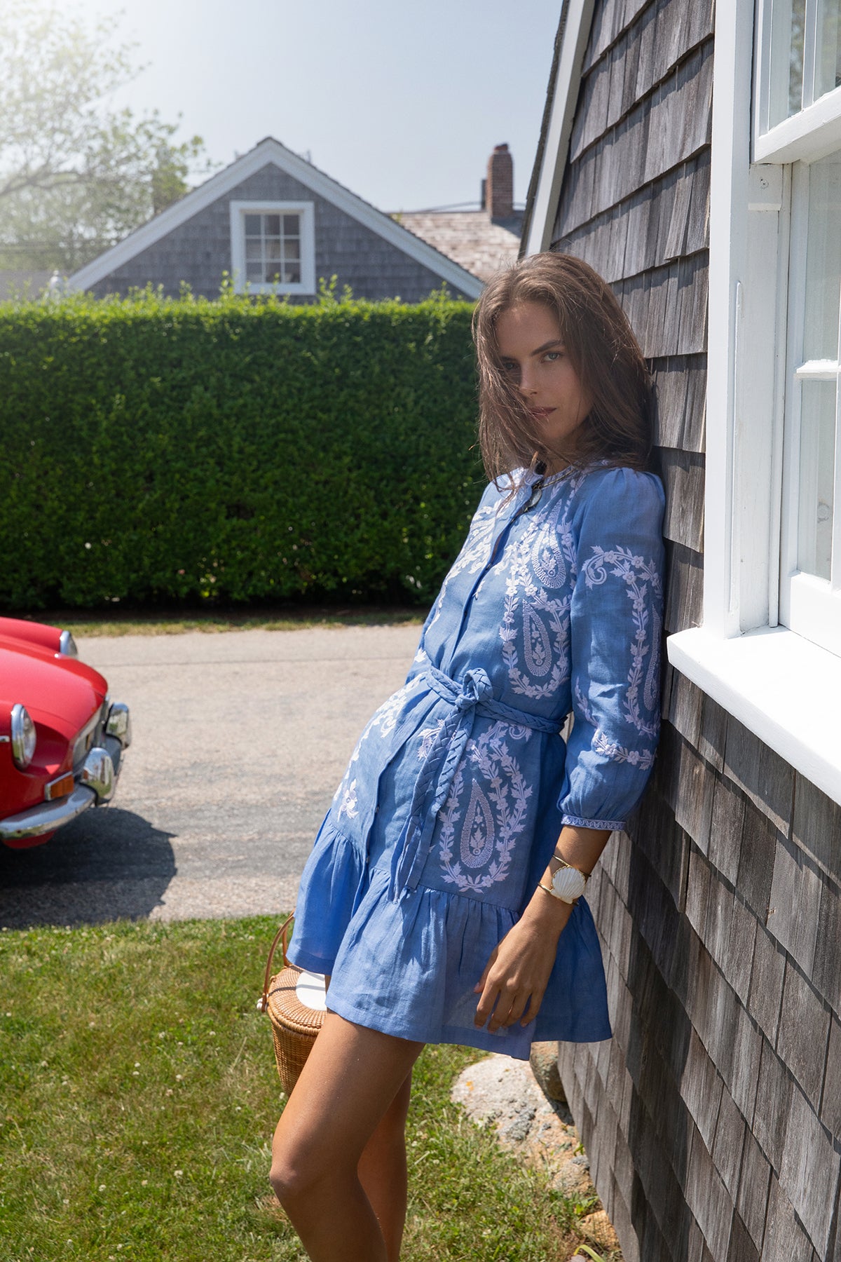 The Imogen Mini Dress in blue linen is effortlessly chic, featuring oversized white paisley embroidery cascading down the front and sides. Billowy sleeves and a tiered silhouette add a feminine touch, while the braided belt cinches the waist for a flattering fit.
