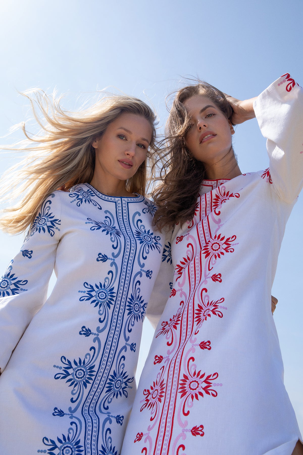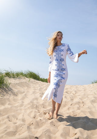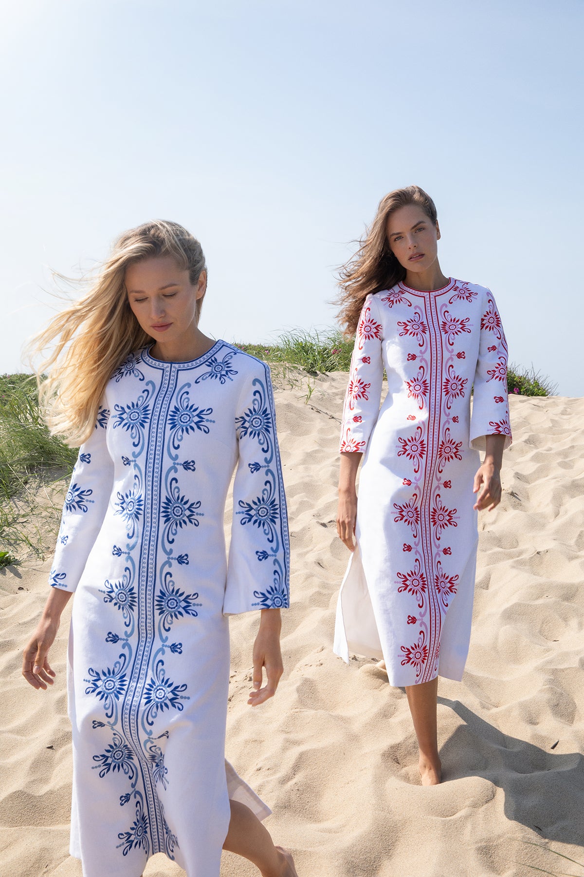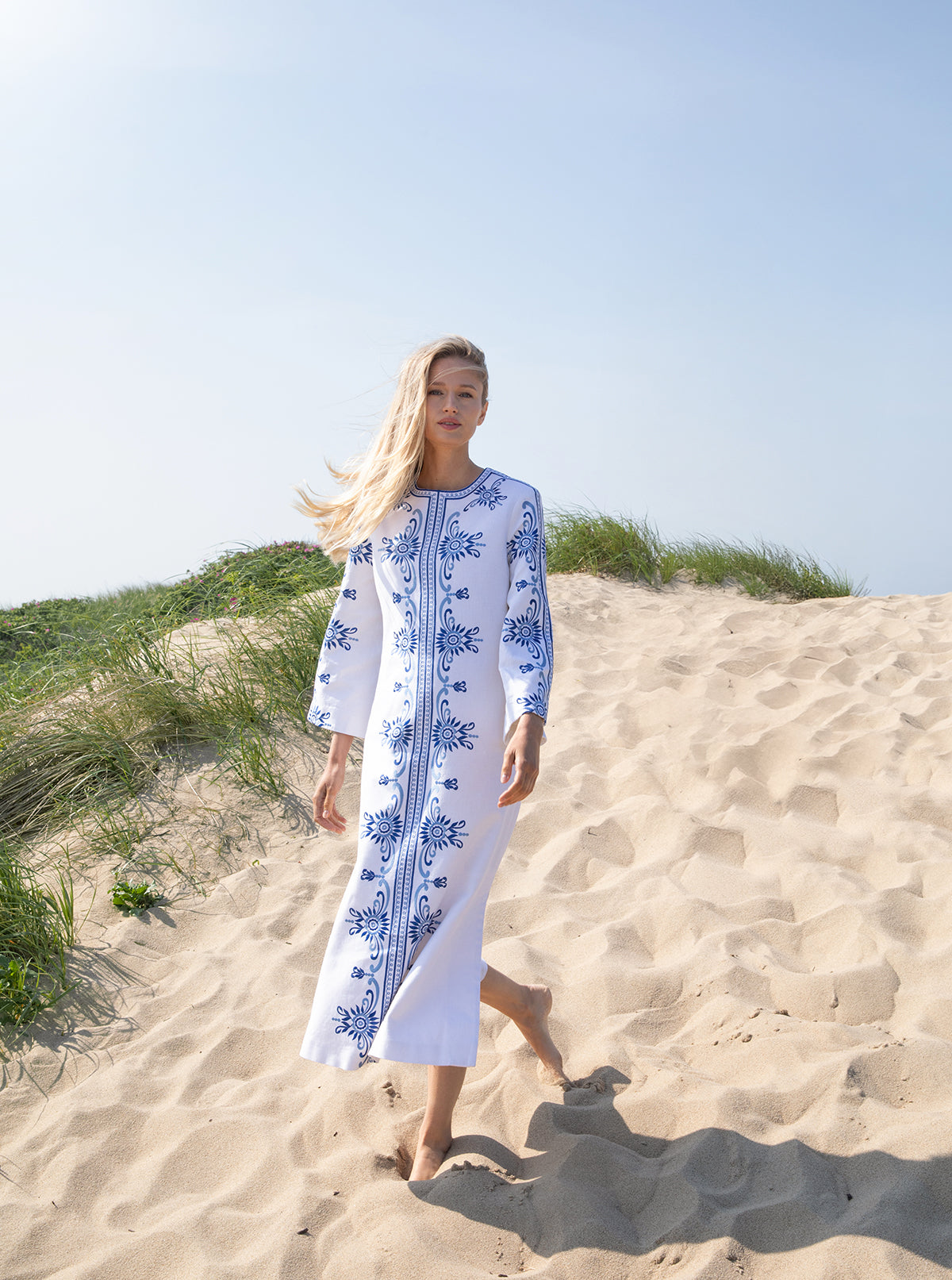 The Claiborne kaftan captures the carefree spirit of 1970s summer glamour with a fresh twist. Cut from crisp white linen and embroidered in navy and cobalt thread, its bold, symmetrical motifs and sculptural bell sleeves evoke vintage resort days. Fully lined in cotton for a structured, tailored silhouette.