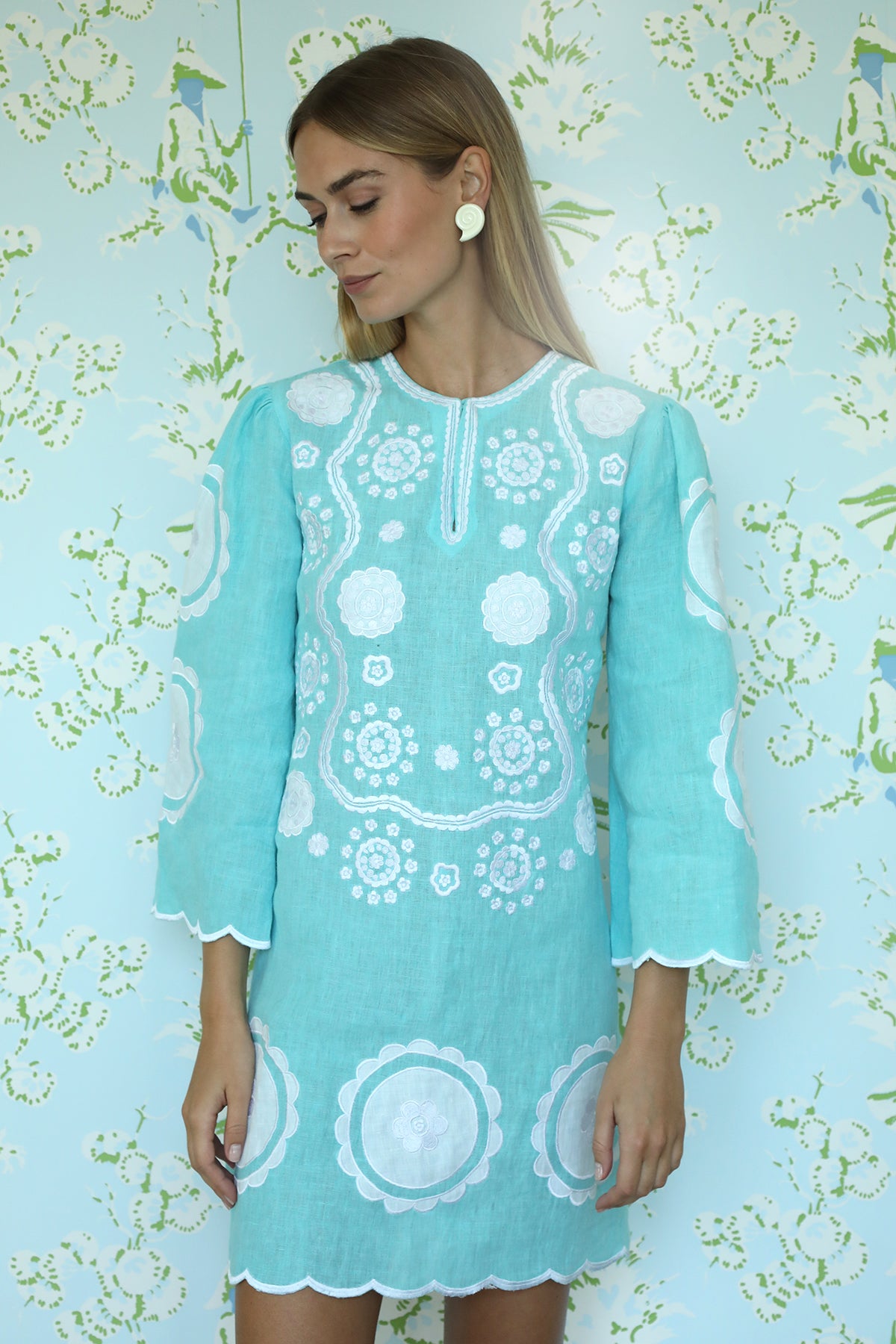 Our bestselling Alice dress now in a new mini silhouette. Alice mini is inspired by chic 60s style, adding a dose of mod flower power to your wardrobe in a fun and relaxed short tunic style. 100% linen featuring bold floral appliqué & embroidery in turquoise and white tones.  Dry Clean Only.