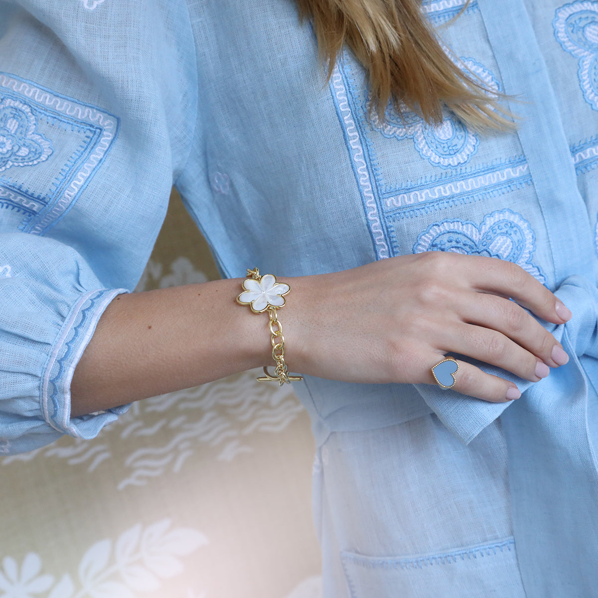 14k gold dipped Eadie toggle bracelet with a mother of pearl flower and cz