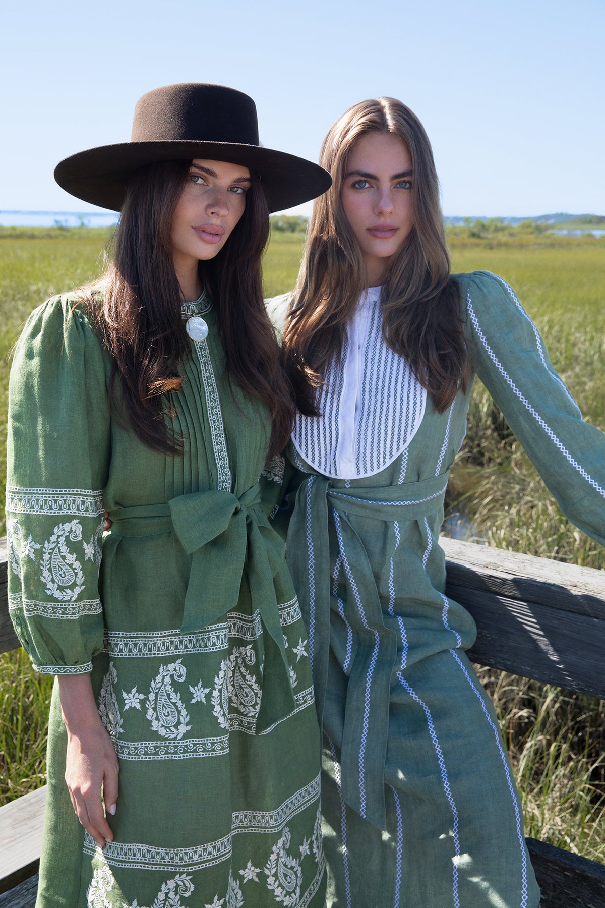 The fall edition of Piper embraces the season in hunter green linen, its gauzy weave embroidered with ivory bohemian paisleys across the sleeves, hem, and waist. Billowing sleeves, a tie waist, and a sweeping skirt create a silhouette that balances effortless ease with statement detail—perfect for crisp autumn days. Runs true to size.
