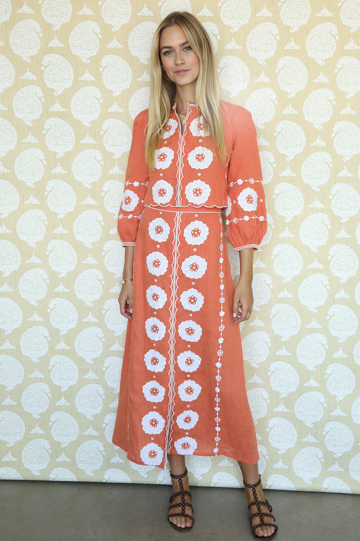 Our bestselling Isabel kaftan now a top and skirt set in our burnt sienna linen featuring white embroidered and applique flowers. A perfect transitional set for late summer into cooler fall nights.
