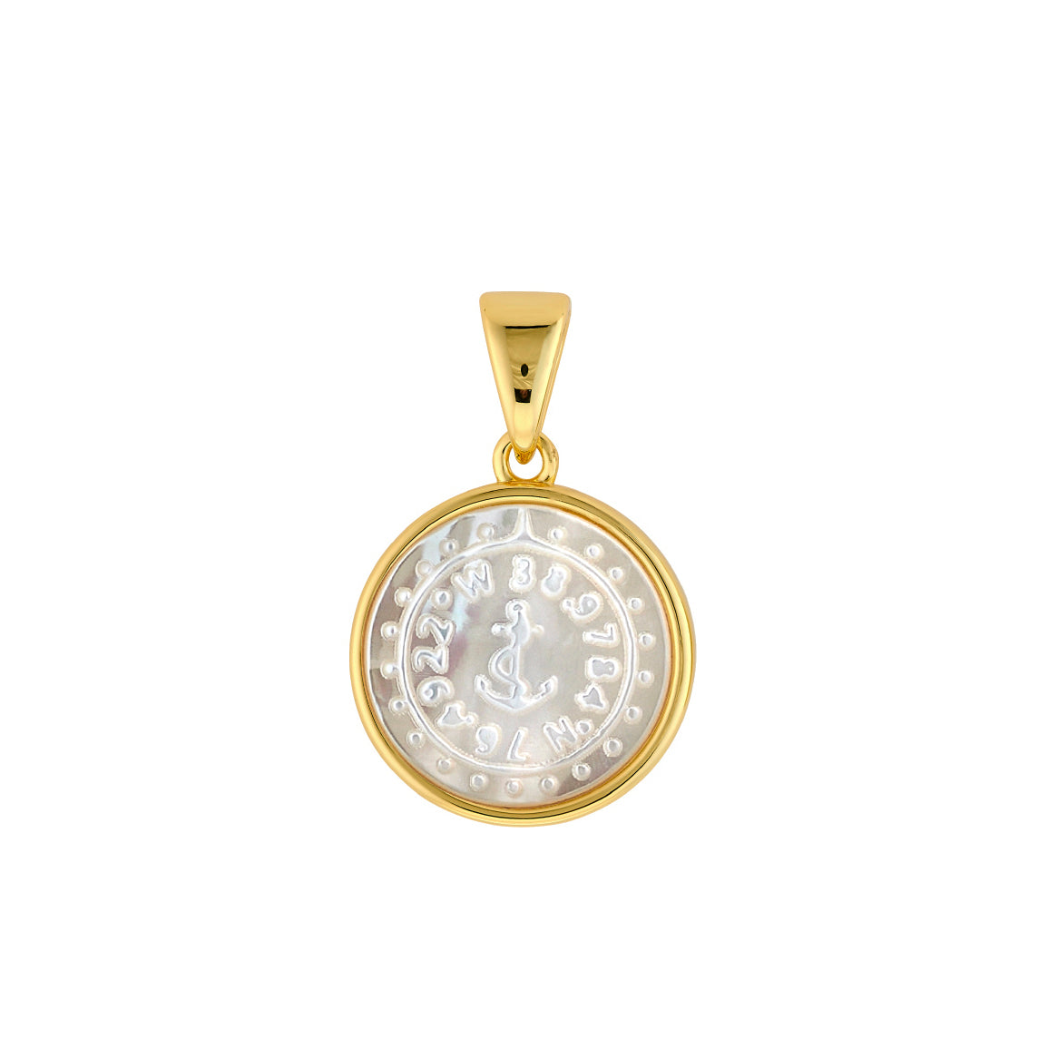 Our classic classic with the nautical coordinates of your favorite destination! Each location has a motif in the center unique to each place. 14k gold dipped classic charm with a 16mm mother of pearl cameo. Chain sold separately.