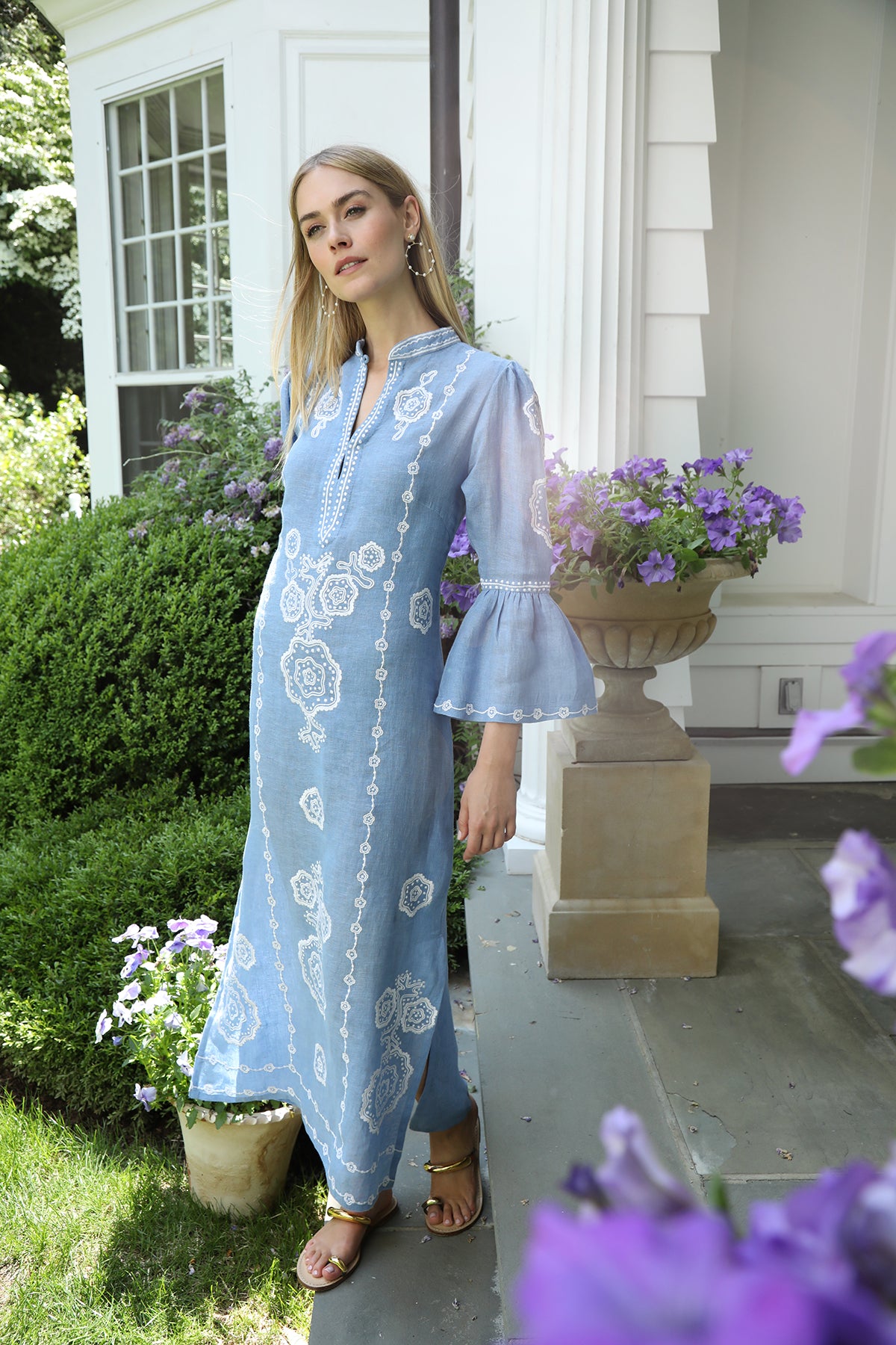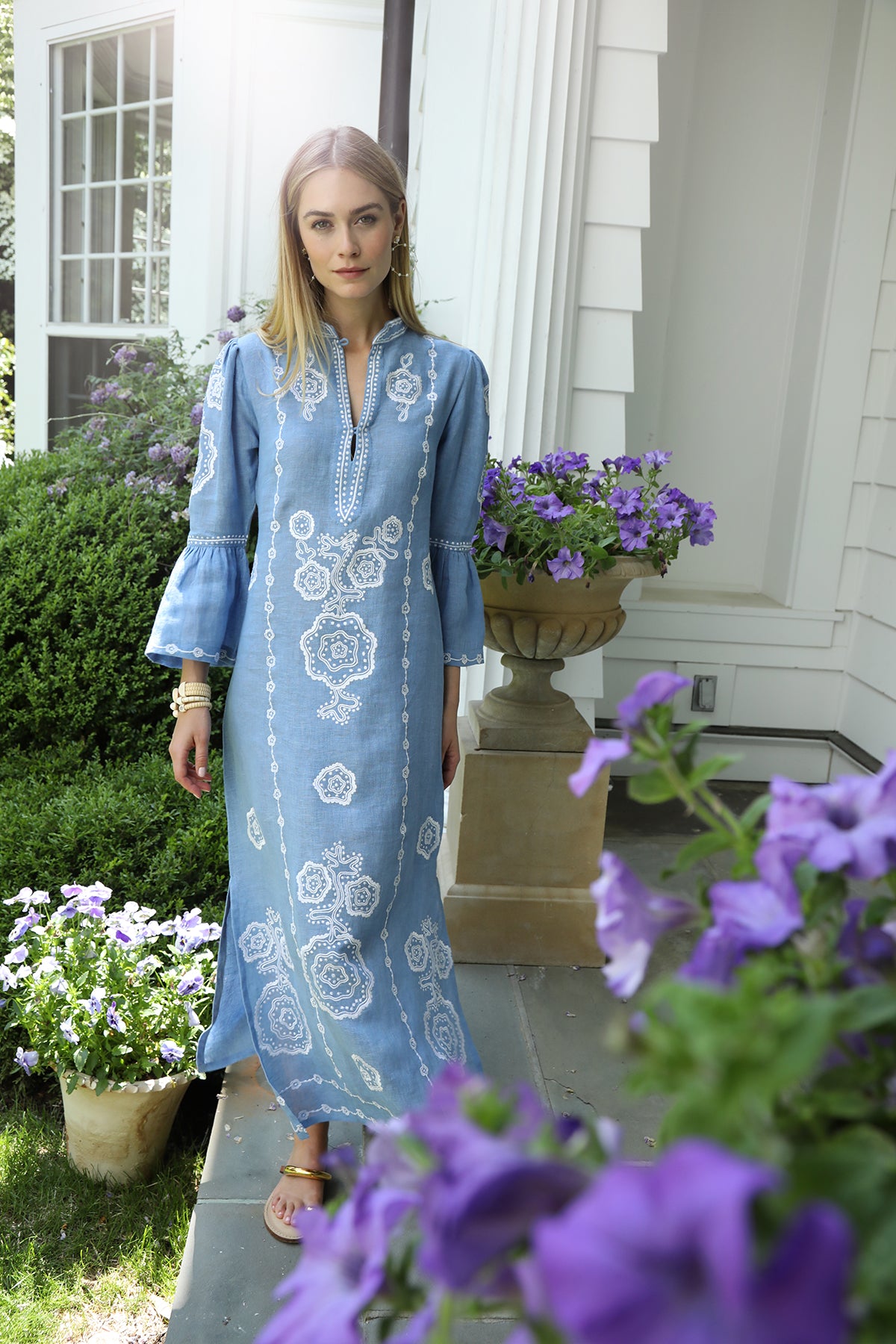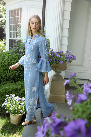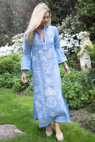Introducing the Hydrangea Amelie Kaftan. Cut from airy blue linen, its refined silhouette is elevated by intricate dotted floral embroidery—a nod to French vintage elegance.