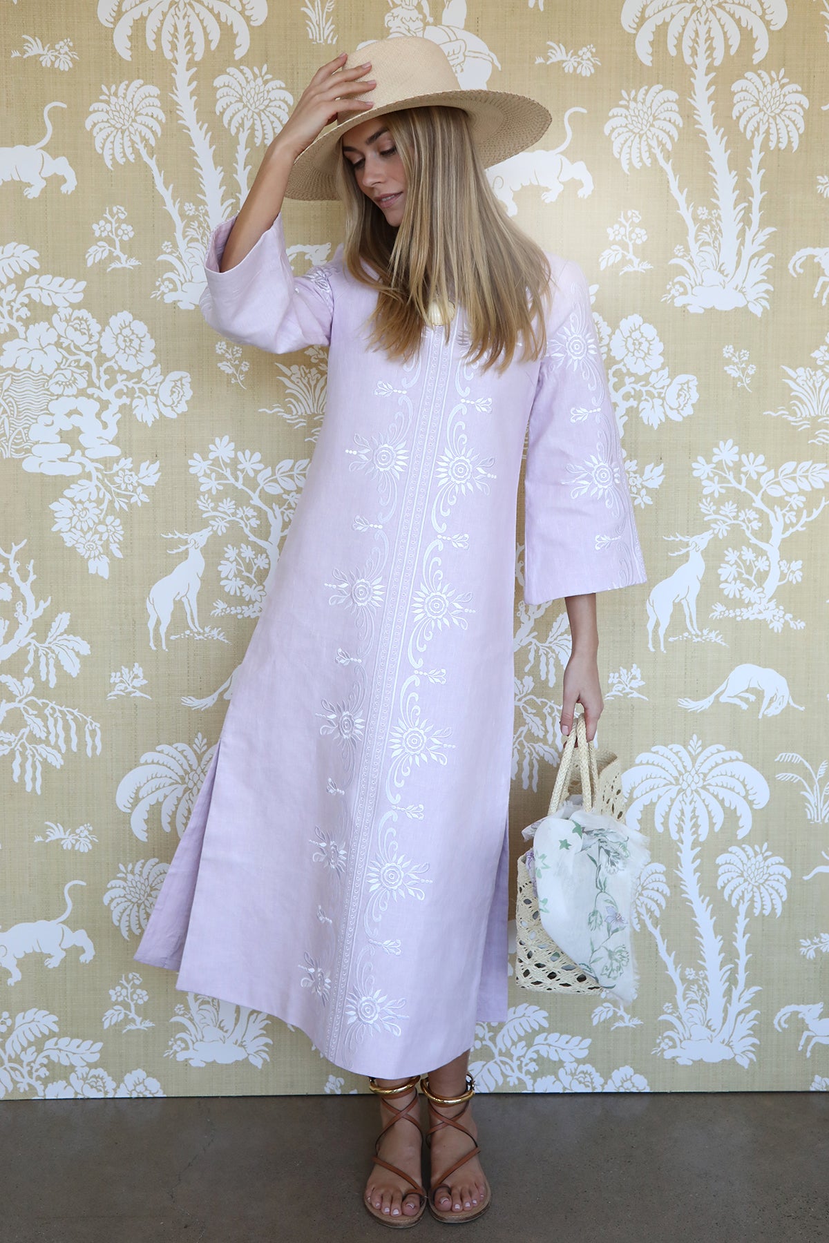 The Lilac Claiborne Kaftan is cut from crisp lilac linen with bold, symmetrical embroidered motifs and sculptural bell sleeves, fully lined in soft cotton for a structured yet fluid silhouette. Chic and refined, this kaftan embodies understated elegance and the relaxed sophistication of 1960s island life.