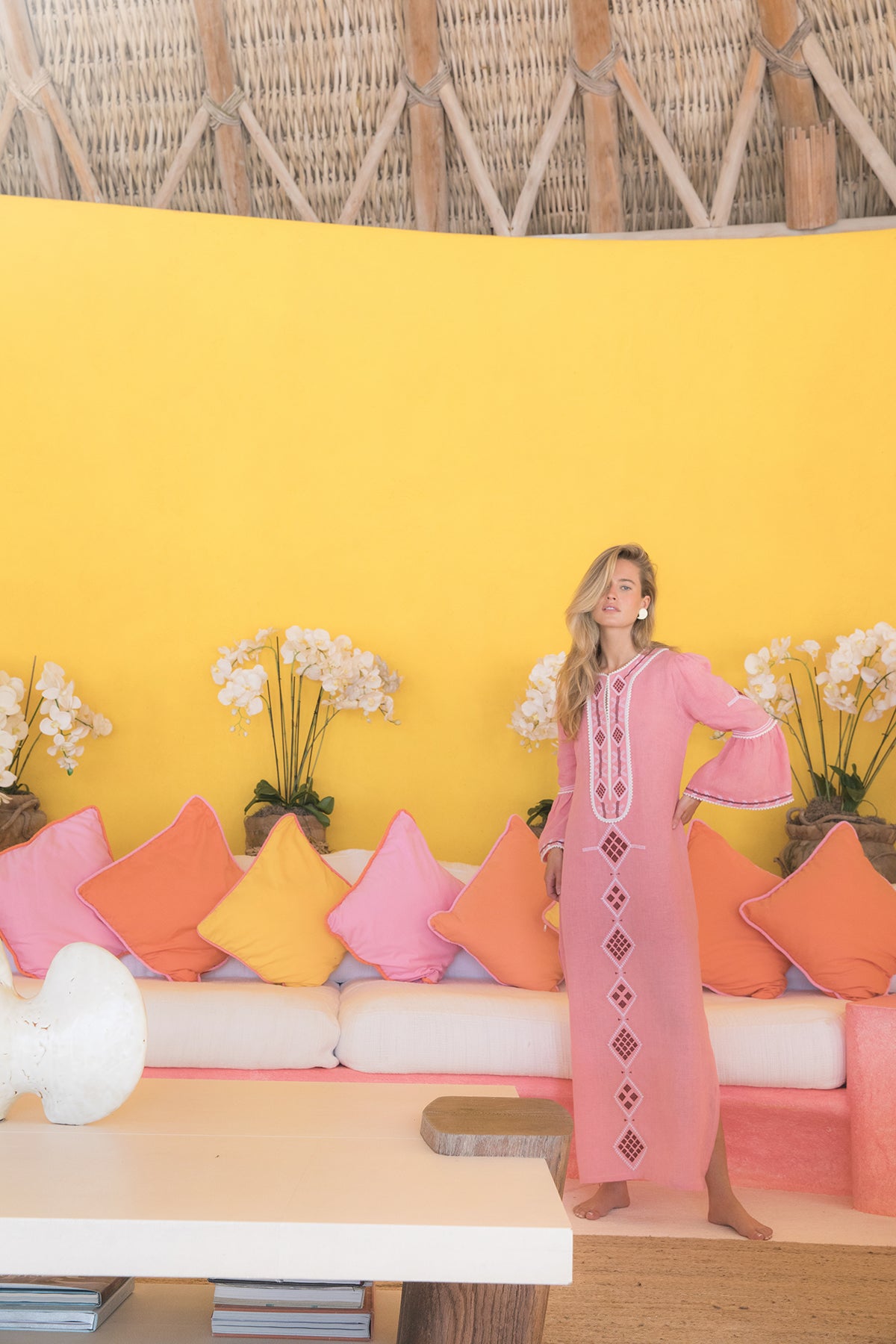 Evoking the opulent 1970s bohemian glamour of Talitha Getty, this sunset-pink dress is both parts graceful and striking.