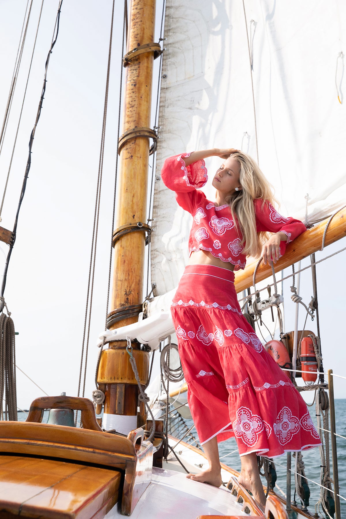 The Willow Skirt reimagines our beloved clover embroidery in bold red linen—evoking the spirit of antique quilts. With scalloped detailing and folk-inspired stitching, this breezy tiered skirt paired with the matching top brings a fresh, feminine edge to heritage craft.