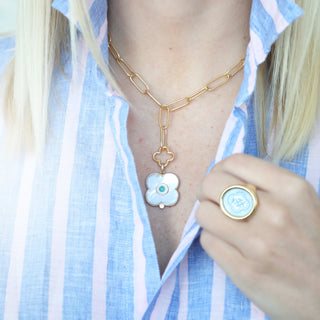 Inspired by Ashley's family trip to Istanbul, this 14k gold dipped turquoise and lapis evil eye charm with white topaz is sure to be an eye catcher. Wear it on its own or layered with any of our other charms. Chain sold separately. Pictured here with the Clover Lariat.